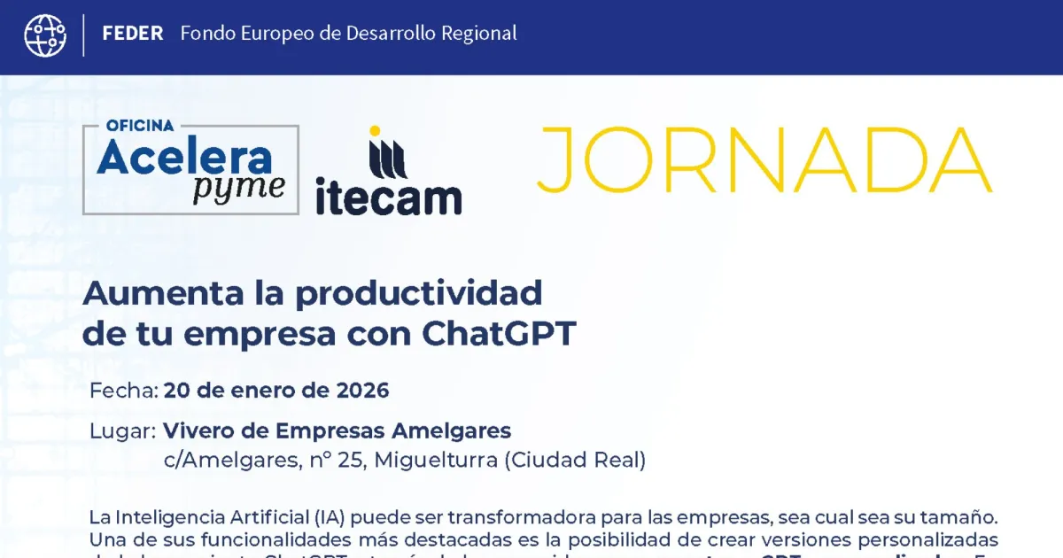 El Centro Tecnológico Industrial de Castilla-La Mancha (ITECAM), junto con i4CAM HUB y el área de Promoción, Desarrollo y Empleo del Ayuntamiento de Miguelturra, ha anunciado la apertura del plazo de inscripción para un curso gratuito enfocado en mejorar la productividad empresarial mediante el uso de la herramienta ChatGPT. Este evento tendrá lugar el martes 20 de enero de 2026, de 15:45 a 18:00 horas, en el Vivero de Empresas «Amelgares» de Miguelturra.