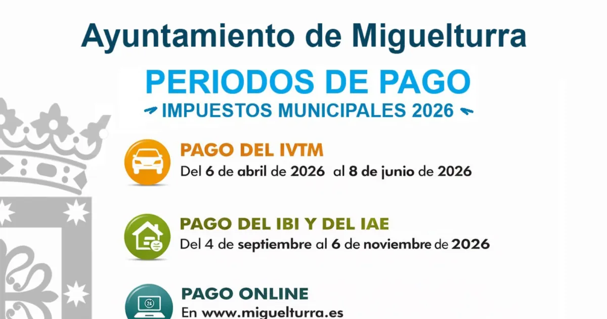 El Ayuntamiento de Miguelturra ha anunciado las fechas clave para el pago de los impuestos municipales durante 2026, destacando una serie de novedades destinadas a facilitar el proceso a los contribuyentes.