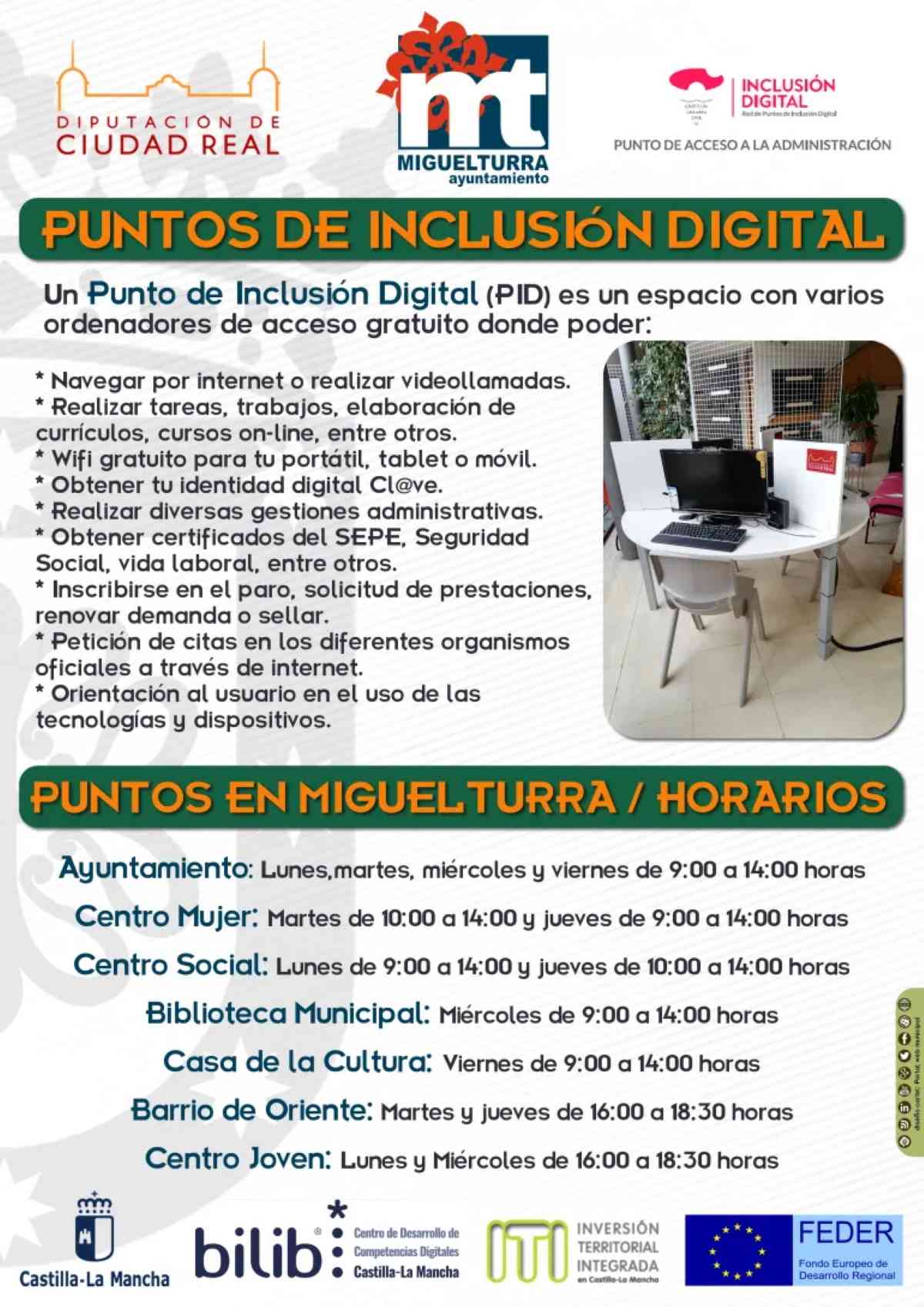 Estos Puntos de Inclusión Digital, que estarán abiertos al público hasta noviembre de 2023, se encuentran ubicados en el Ayuntamiento, Centro de la Mujer, Centro Social, Biblioteca Municipal, Casa de la Cultura, aula del Barrio de Oriente, Centro Joven, Vivero de Empresas y Peralvillo, y cuentan con personal especializado (dos técnicas) que van rotando para ser usados por el público en las fechas y horario establecido.