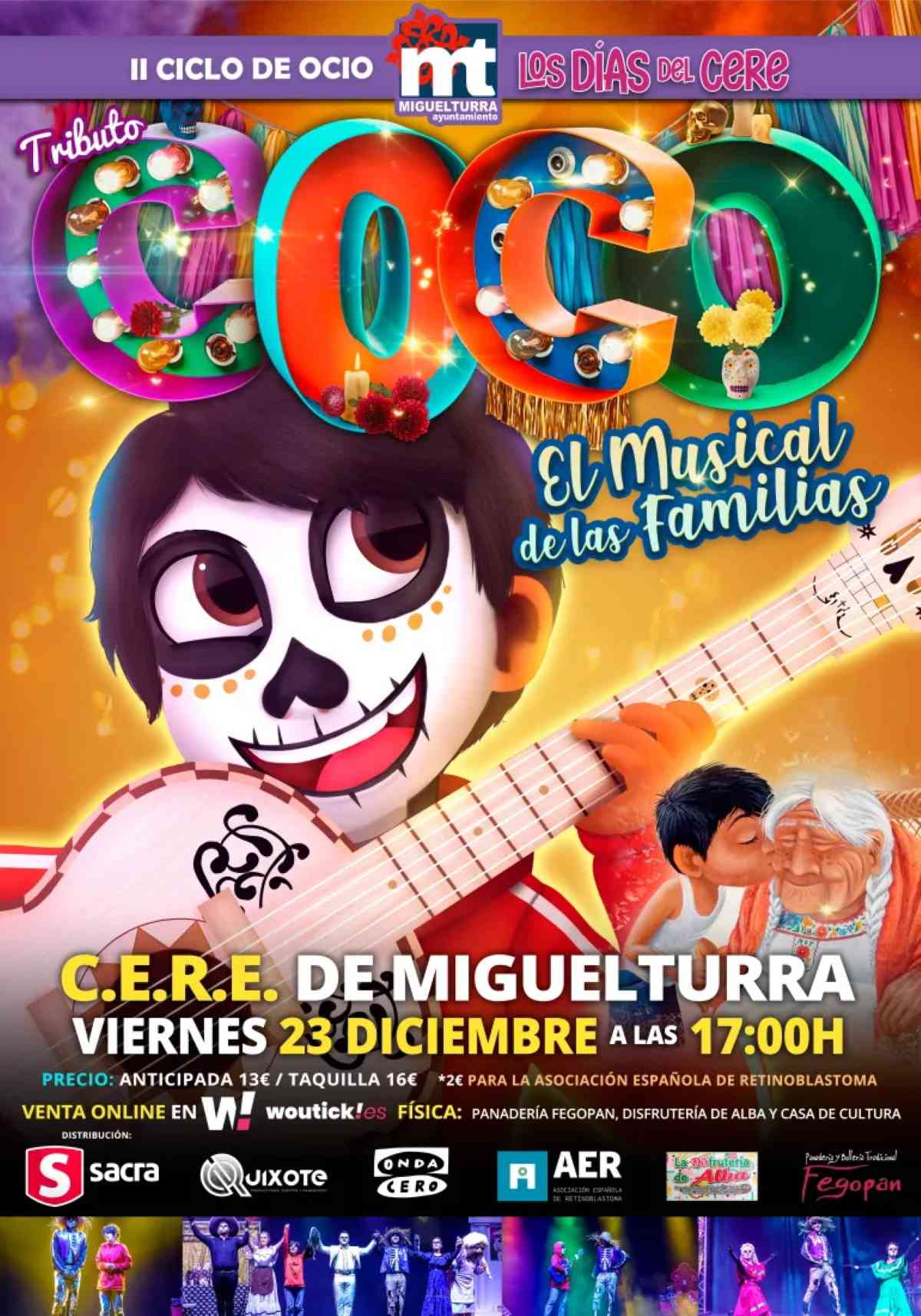 Un concierto homenaje a la película de animación de Disney “Coco” tendrá lugar en el CERE de Miguelturra (Ciudad Real) el viernes 23 de diciembre de 2022 a las 5 de la tarde. Un evento solidario ya que 2 euros del precio de la entrada se destinarán a beneficio de la Asociación Española de Retinoblastoma. Y las entradas tienen un precio de 16 euros en taquilla y 13 euros en anticipada, la cual se puede adquirir a través de internet en la plataforma Woutick.es y de forma presencial en la Casa de la Cultura, en la Panadería Fegopán de Miguelturra o en la frutería «La Disfrutería de Alba».