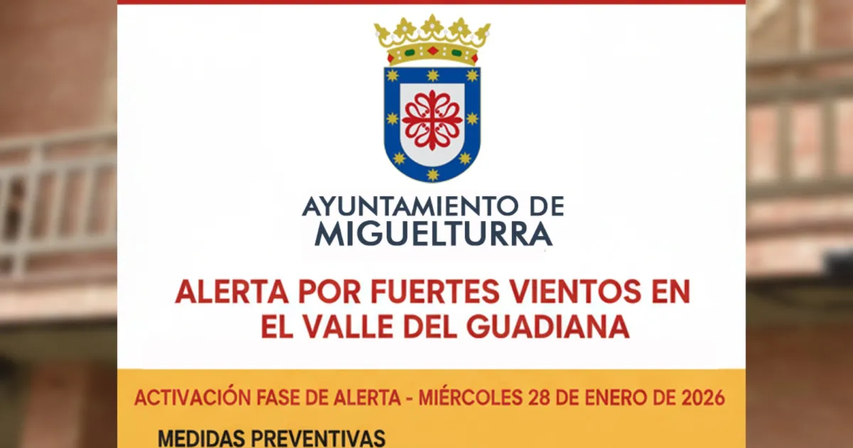El Ayuntamiento de Miguelturra ha activado la fase de alerta del Plan de Actuación Municipal ante fenómenos meteorológicos adversos. Esta medida, efectiva desde el miércoles 28 de enero de 2026, responde a la alerta emitida debido a los intensos vientos que afectan al Valle del Guadiana, con rachas que podrían alcanzar los 90 kilómetros por hora.
