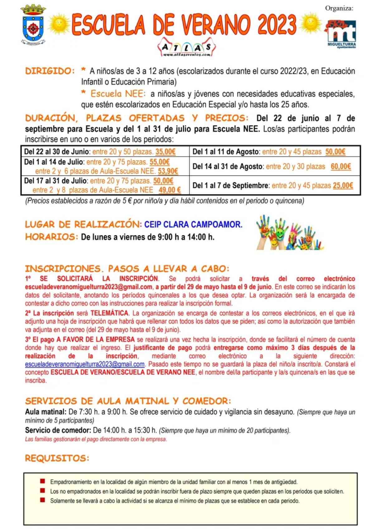 La “Escuela de Verano” está dirigida también a niños y niñas de 3 a 12 años, escolarizados durante el curso 2022/2023, en Educación Infantil o Educación Primaria, y con un aula para niños y jóvenes con necesidades educativas especiales, que estén escolarizados en Educación Especial y/o hasta los 25 años.
