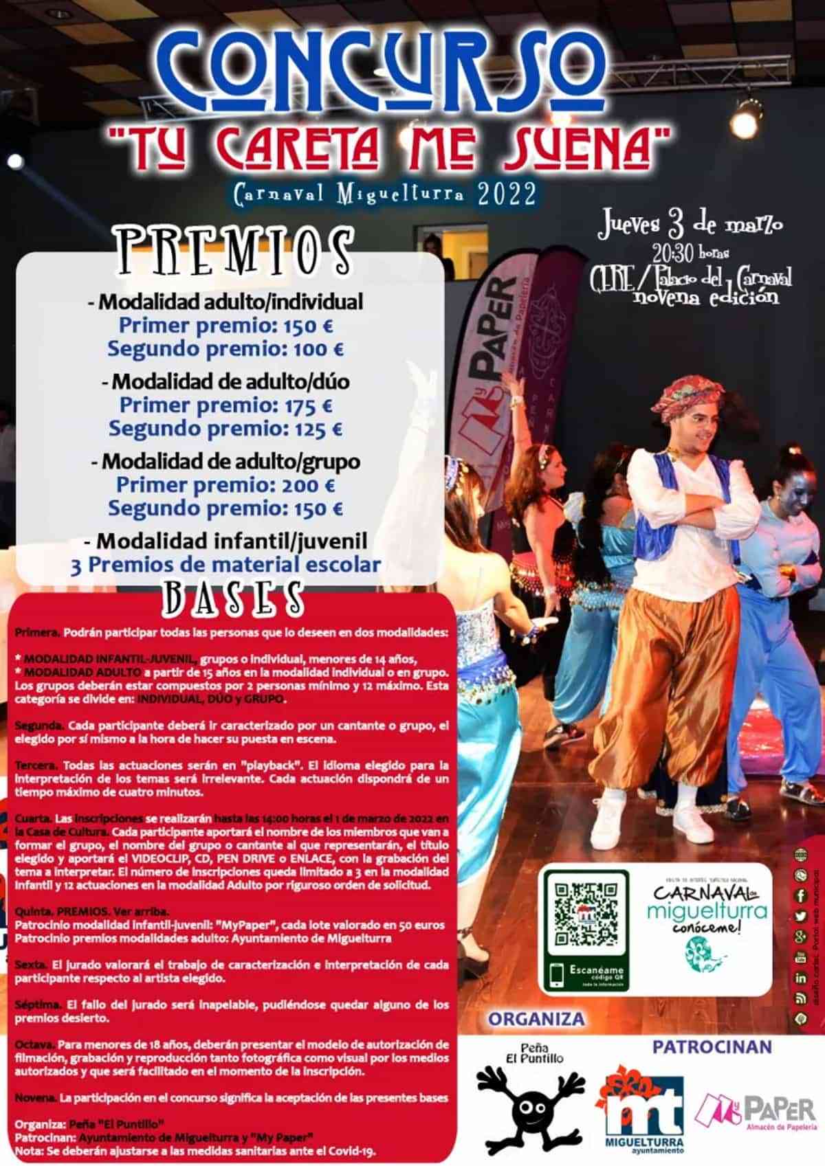 Las inscripciones al concurso «Tu careta me suena» se realizarán hasta las 14:00 horas el 1 de marzo de 2022 en la Casa de Cultura. Cada participante aportará el nombre de los miembros que van a formar el grupo, el nombre del grupo o cantante al que representarán, el título elegido y aportará el VIDEOCLIP, CD, PEN DRIVE o ENLACE, con la grabación del tema a interpretar. El número de inscripciones queda limitado a 3 en la modalidad Infantil y 12 actuaciones en la modalidad Adulto por riguroso orden de solicitud.