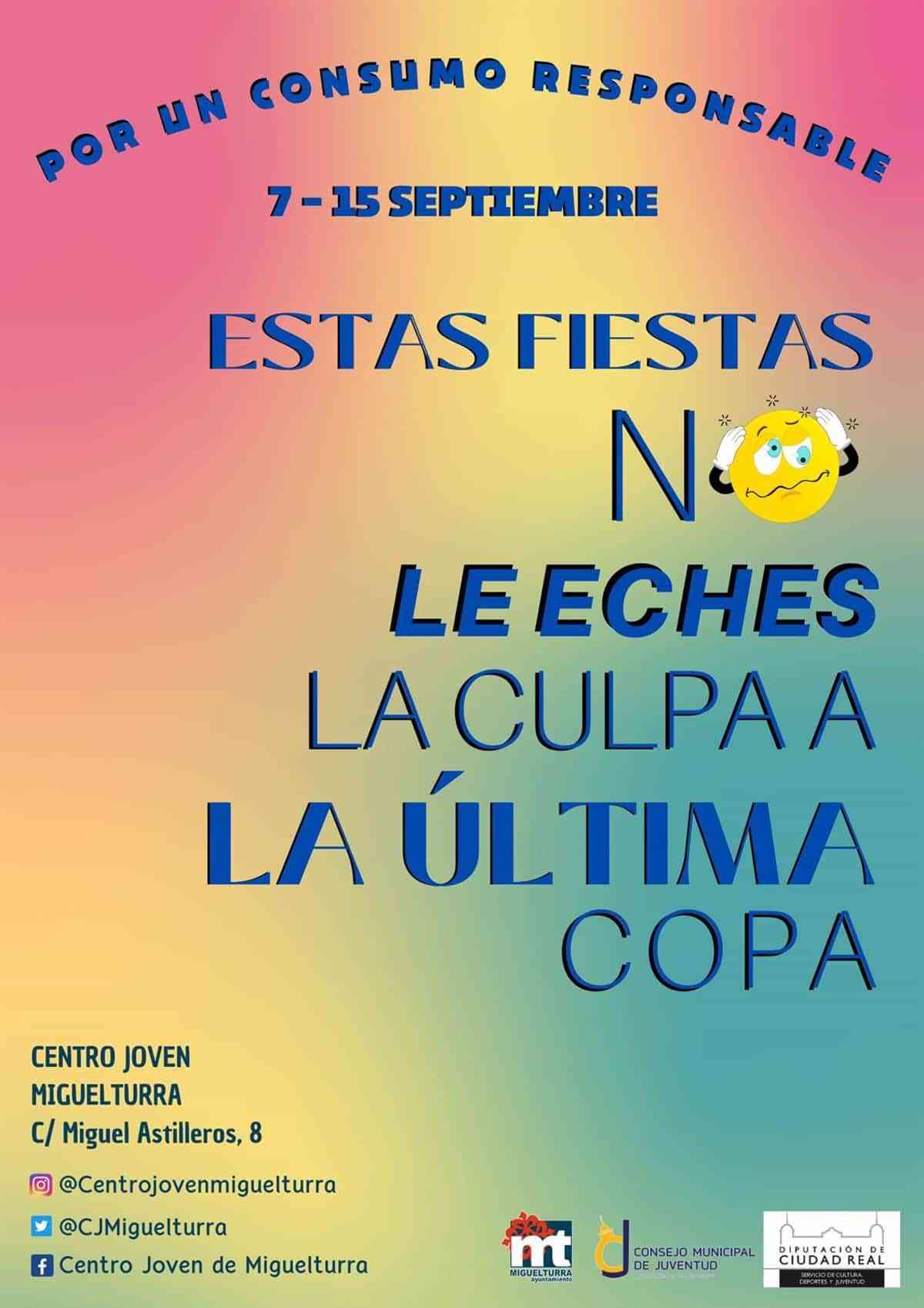 El Área de Juventud del Ayuntamiento de Miguelturra ha presentado una campaña de concienciación sobre el peligro del consumo de alcohol durante las próximas ferias y fiestas patronales, que se llevará a cabo del 7 al 15 de septiembre bajo el lema ‘Este año no le eches la culpa a la última copa’.