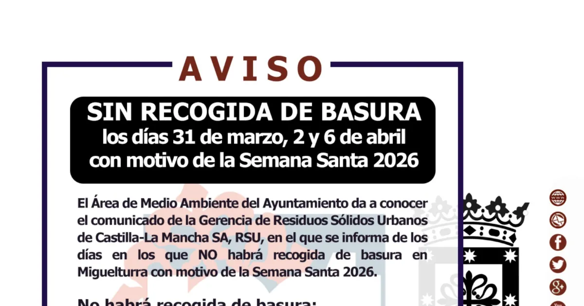 El Área de Medio Ambiente del Ayuntamiento de Miguelturra ha comunicado, a través de la Gerencia de Residuos Sólidos Urbanos de Castilla-La Mancha SA (RSU), los días específicos durante la Semana Santa en los que no se realizará la recogida de basura en la localidad. Se trata de una medida que busca ajustar los servicios a las festividades, mientras se gestiona eficientemente la limpieza urbana.